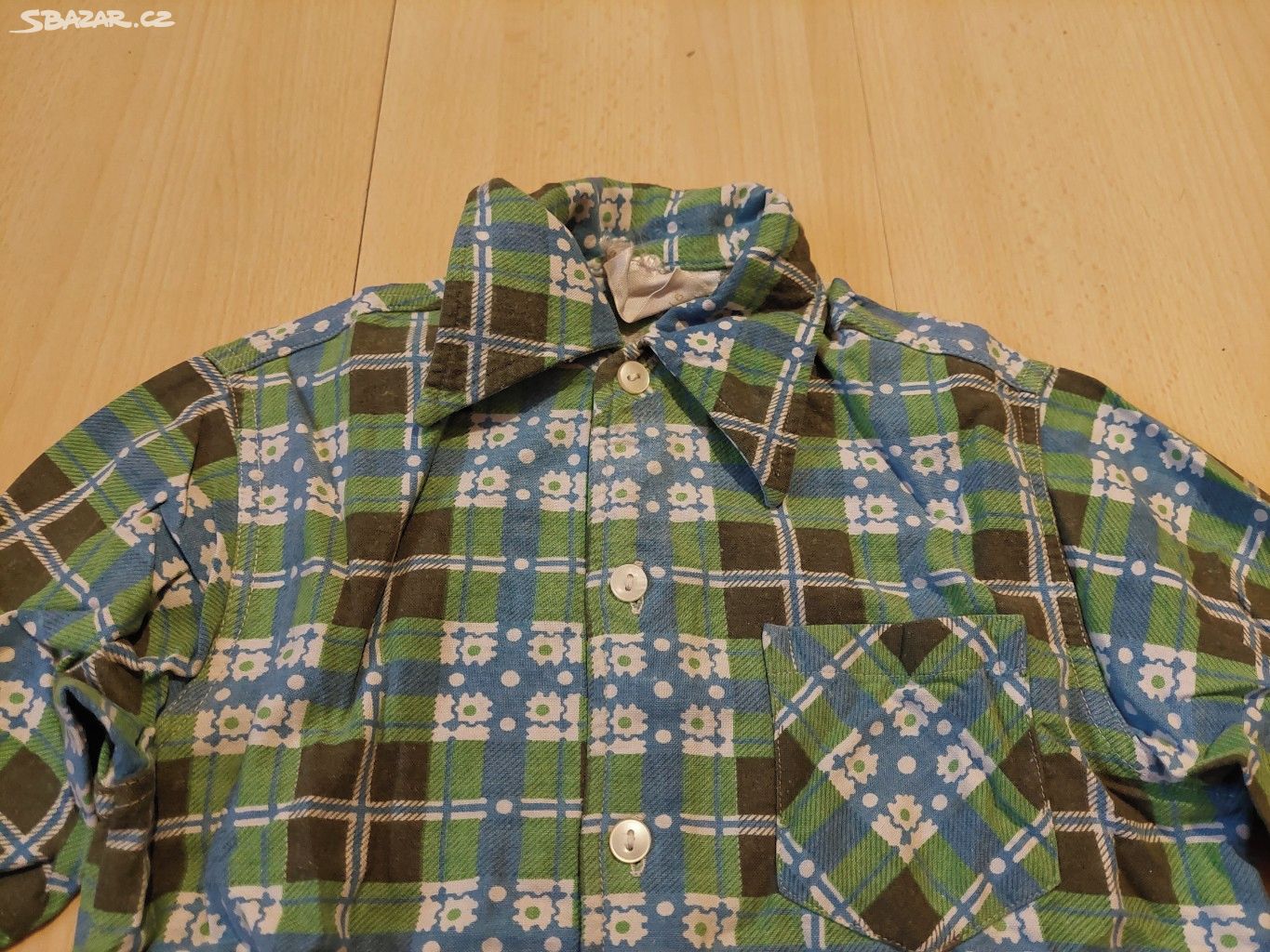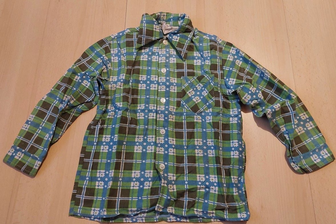 Našel jsem tento retro vzor dětských košil ale podle štítků to nevypadá na klasiku Šumavan nebo Triola či další. Přitom retro socialistické vzory to jsou a má to dvoudírkové knoflíky. Hlavně ta první je pěkně strakatá.